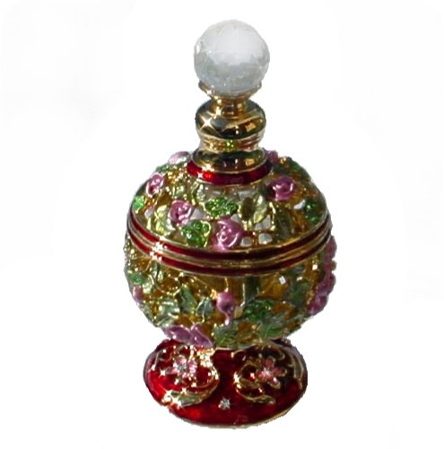 A plastic funnel is included so that you can easily transfer your favorite perfume into the glass bottle which resides inside the filigree of rosettes. Bottle is made even more special because you can "see through" it, due to the cut away nature of the design. Sure to be your favorite collectible!