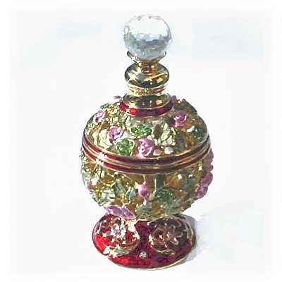 "Perfume Bottle set with Swarovski Crystals! Round Pink Antique French Vintage Style Roses Red Pink Green 24K Gold Pewter Filigree Cut away design Certificate of Authenticity" Overview